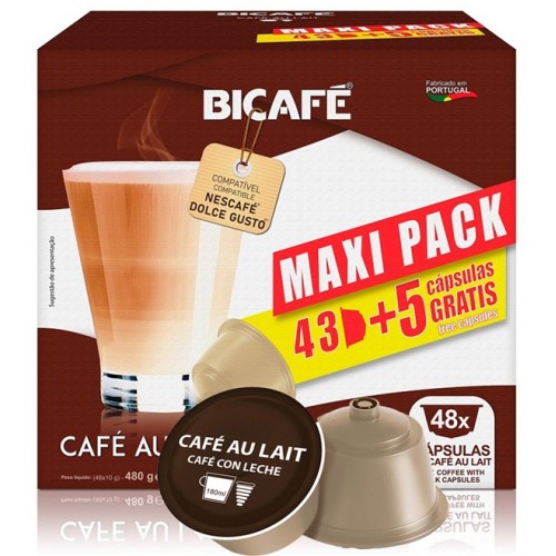 BICAFÉ Café con Leche Sin Azúcares Añadidos (* )- Maxi Pack (43 + 5 Cápsulas Gratis) - Compatibles Dolce Gusto